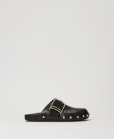 Calf leather mules with macro side buckle and studded trim.