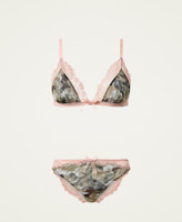 Camouflage print tulle and stretch lace lingerie set consisting of non-padded triangle bra and g-string.