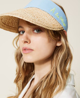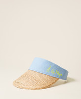 Visor with straw brim and fabric band with neon-coloured writing.