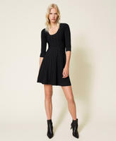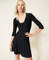 Feminine silhouette for this stretch viscose crêpe short dress with tubular work and metal half-sphere micro studs enhancing the front. Fitted top part and godet flared skirt, round neck, three-quarter sleeves, central logo plate on the back. Adds boldness to your everyday looks and special occasion outfits.