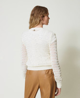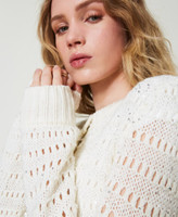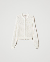 Cardigan made from yarn brightened by micro sequins, openwork creates a striped effect, crew neck, snap button fastening, long sleeves, ribbed trims, metal Oval T logo plate at the back, loose fit.