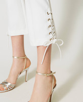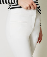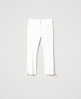 Versatile, but with an extra twist. Stretch Milano stitch cropped trousers with weaved trim threaded in metal eyelets at the hem. Straight fit, mannish zip and hook closure, double welt pockets. Easy to match with any item in your wardrobe; complete them with the coordinated bomber jacket for a contemporary outfit.