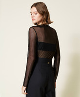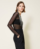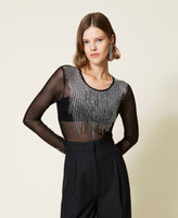 Tulle blouse with fringe effect rhinestone appliqués, raw cut hem, removable sash.