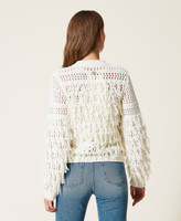 See-through effect for this wool blend jacket made in Italy with machine-made mesh and fringe work. Straight fit, round neck, wide sleeves, ribbed trim, hidden snap button closure, Oval T logo plate on the back. Knit appeal that will lift all your everyday outfits.