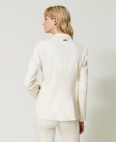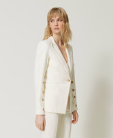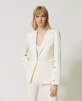 Milano stitch blazer with pointy lapels, long sleeves with decorative buttons, crêpe de Chine lining.