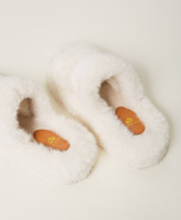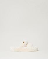 Faux fur crossover slides with metal heart logo on the side and rubber sole.