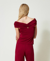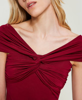 Fitted top made from shiny viscose jersey with draping and criss-cross in front that can be worn on or off-shoulder.
