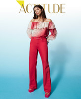 Actitude collection flared bull trousers with five pockets, zip and button closure, appliquéd metal rivets.