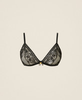 Non-padded lace triangle bra with floral pattern and tulle lining. Scalloped cups, side boning, covered shoulder straps at the front and adjustable at the back, two-hook fastening, organza bow and heart-shaped metal logo between the cups.