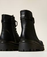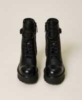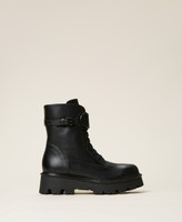 The newest Twinset combat boots are made of shiny calf leather with enamelled tonal Oval T logo, inner zip, rubber sole. They will be you starting point for urban outfits with denim or miniskirt.