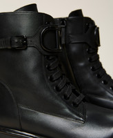Shiny calf leather combat boots with enamelled tonal Oval T logo, inner zip, rubber sole.
