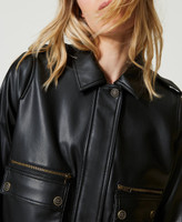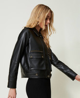 Jacket made from faux plongé nappa leather with shirt collar, metal zip, maxi flap pockets in front and lining.