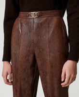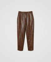 Trousers made from coated fabric with lizard leather effect on a slightly embossed background. Regular waist, side zip fastening, slant pockets on the sides and welt pockets at the back, front ribbing, removable matching belt with metal Oval T logo buckle, cigarette cut.
