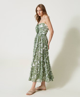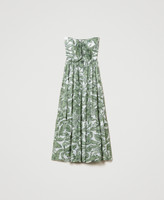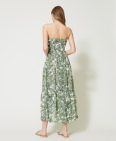 Midi bustier dress made from georgette with leaf print, strapless, flounced skirt, lining.