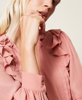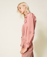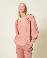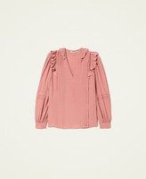 Loose fitting blouse made of silk blend crêpe de Chine with ruffled finish on V neck and shoulders.