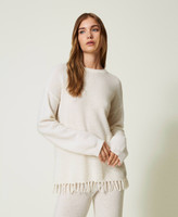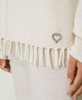 Stretch wool crew neck jumper with long sleeves, appliquéd fringes at the hem, metal heart with rhinestones.