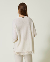 This wide fitting crew neck jumper made from stretch wool, with long sleeves and ribbed trim, will give a twist to your seasonal outfits. Features hand-appliquéd fringes at the hem and a rhinestone-studded metal heart low on one side. Create an urban outfit, wearing it with skinny leather trousers and biker jacket.