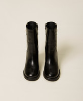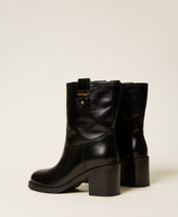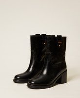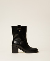 Wide leg leather ankle boots, wide heel, logo lettering detail on the side, tunit sole.