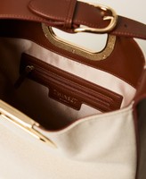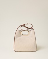 Lila hobo bag made from canvas with two-tone warp finished with faux natural leather. Magnet closure, double metal handle with logo, wide adjustable strap for shoulder or cross-body wear, galvanized gold-tone accessories.