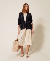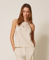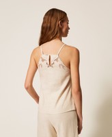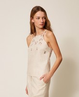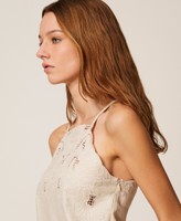 Viscose and linen blend top with yoke embellished with scalloped floral openwork embroidery. Thin shoulder straps, side zip fastening, teardrop opening with button on the back, slim fit.