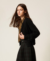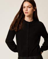 Crew neck viscose blend cable knit cardigan with lurex. Long sleeves, matching colour button fastening, heart-shaped logo plate at the back, straight fit.