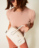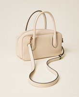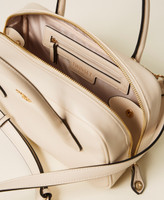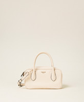 Medium bowler bag made from smooth faux natural calf nappa leather. Double zip closure with eyelets on pullers to attach charms, double tubular handle that can be worn over the shoulder, adjustable and removable shoulder strap for cross-body wear, metal lettering logo. Can be worn open on the sides, tote style. Lining and internal pockets.