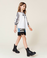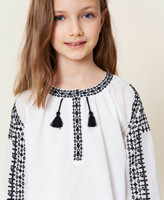 A handmade embroidery is the unique touch on the is cotton muslin Girls’ blouse. Long raglan sleeves with cuffs, gathered neckline, polo shirt opening, side slits. Easy to match, also for a special occasion.