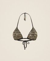 Triangle bikini top with gold thread sequin embroidery. Padded, with removable cups and straps that tie-up behind the neck or work as shoulder straps thanks to eyelets at the ends, tie-up fastening on the back, lining.