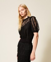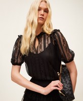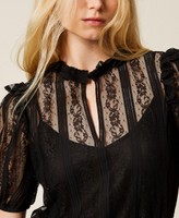 Lace blouse with vertical stripes positioned to match the design. Ruffled collar, short puff sleeves, teardrop opening with button on the front, crêpe de Chine slip top, straight fit.