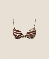 Animal print charmeuse triangle bra. Padded with non-removable cups and side boning, covered shoulder straps at the front and adjustable logoed elastic at the back, two-hook fastening, organza bow and heart-shaped metal logo between the cups.