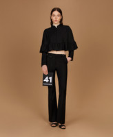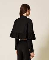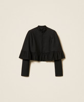 Wool and viscose stretch fabric cape jacket made in Italy. Tailoring inspiration with matte look. Stand up collar, long tapered sleeves covered by a cape finished with a gathered flounce, shoulders supported by light padding, fitted closure with hooks, lining, fitted.