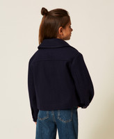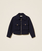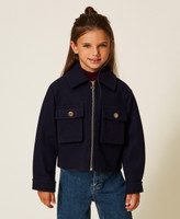 Girls' wool cloth caban jacket with gusset patch pockets at the front and metal logoed button. Shirt collar, metal zip fastening with logoed zip puller, long sleeves with slouched shoulders, cuffs with buttons and buttonholes, lining, straight fit.