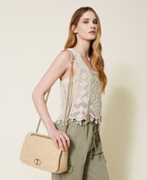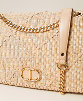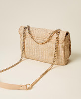 Bag with raffia-like flap with tonal threading, sliding chain strap, clip closure.