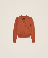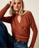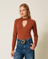 Stretch viscose jumper with cross-over that creates a cut-out pattern at the front. Turtleneck, long sleeves, ribbed trims, Oval T logo plate on the back, loose fitting.