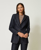 Single-breasted denim blazer with lapels, single-button closure, flap pockets, contrasting stitching.