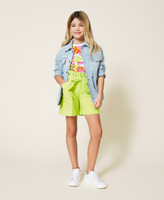 Bleach wash denim jacket, studded trim, snap button closure, wide fit.
