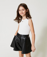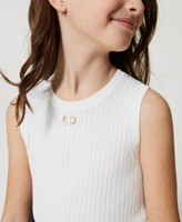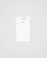 Wide rib stretch viscose knit top, fitted, with metal Oval T logo in front and wide border hem.