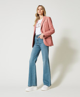 - 99% cotton 1% rubber. Pocket lining: 65% polyester 35% cotton.