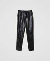 Leather-like skinny leggings with elasticated waist, metal logo plate on the back.