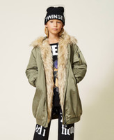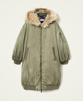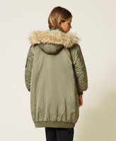 Long technical fabric bomber jacket with long fibre fabric trim on hood and opening, padding.