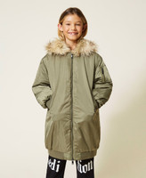 Nineties’ inspiration for this Girls’ long bomber jacket made of technical fabric and featuring a long fibre fabric trim inside the hood and opening. Loose fitting, dual cursor zip closure, welt pockets on the side, ribbed hem, small pocket on the sleeve. Padded and lined with logo fabric. Perfect for school and all your little girl’s daily activity.