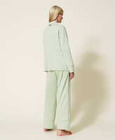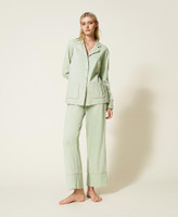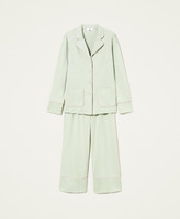 Comfy and sophisticated, this mannish cotton interlock pyjamas with contrasting piping are composed by tunic with lapels, covered buttons, cuffs and buttons, front pockets, logo label on the back and straight trousers with elasticated waistline and wide border at the hem. Perfect if like your nightwear both stylish and comfy.