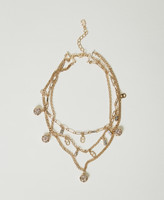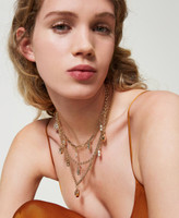 Multi-strand necklace with different chains featuring Oval T pendants with inset crystal rhinestones, galvanized pale gold, adjustable lobster clasp closure.