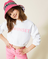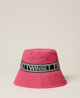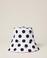 Reversible fisherman’s hat, terry cloth with jacquard logo on one side and printed polka dots on the other.