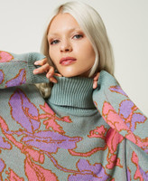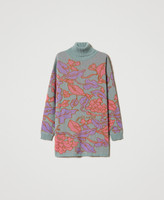Maxi jumper made in Italy from the Treeblend yarn, in collaboration with Marco Rambaldi. Four-tone pique jacquard work with vine leaf pattern and placed “Innesto d’amore” writing. Loose fitting, with turtleneck, ribbed hem, inner label with jacquard logo and contrasting two-tone lettering logo. The Treeblend project aims to lower CO2 emissions, with an expected 20% reduction relative to traditional knitwear production. The yarn contains 50% of recycled materials (PA and 50% wool), and the viscose it contains is parly derived from production waste material from Twinset's weaving processes. Materials are washed without any chemical solvants to reduce water consumption. Packaging is fully recycled.