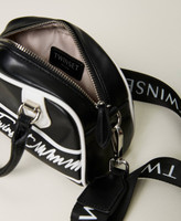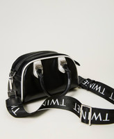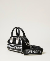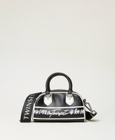 Bowler bag made from shiny calf leather-like fabric, with lettering print in front, removable jacquard logo strap.