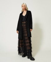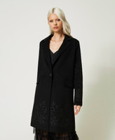 This coat made from wool blend double fabric features fine craft work, clean lines with flat inner stitching and no lining. It is enhanced with an openwork floral thread-embroidery, an exclusive Twinset design. Thin lapels, single-breasted tonal button closure, flap pockets, rear slit, Oval T logo plate. Your style ally for the winter.