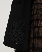 Single-breasted coat made from doubled wool blend with openwork floral thread-embroidery, mannish lapels and no lining.