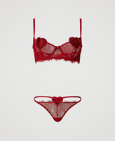 Lace set comprising balconette bra and g-string with heart patch with shiny rhinestones. Non-padded bra with tulle lining, solid colour tone-on-tone satin border on trims, underwire, and cups, scalloped trim, side bones, adjustable shoulder straps made from logoed elastic at the back, two-hook fastening, metal heart logo with satin and lace bow between the cups. Lace g-string with scalloped waist, scalloped elastic trims, and elastic covered in satin at the sides.