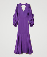 Long jacquard viscose dress with micro polka dots, long sleeves with gathered ruffles, cutout on the back, on the bias flounce at the hem.